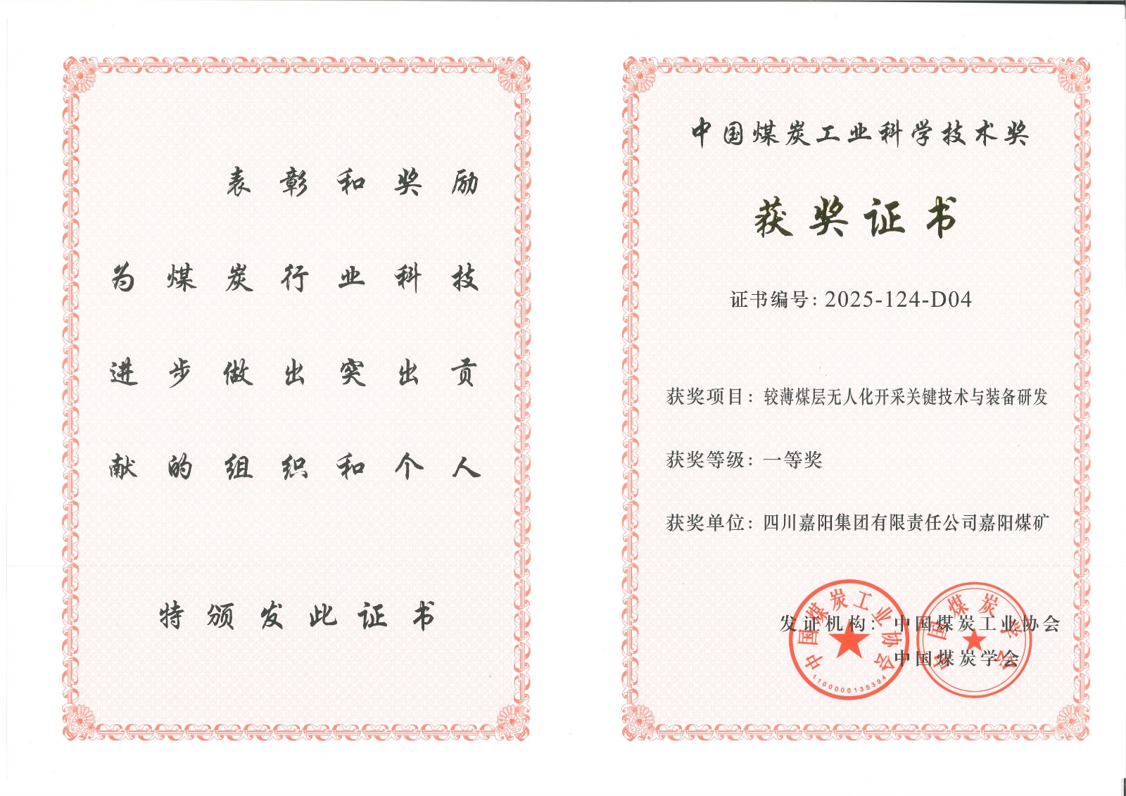 近日,2025年度中国煤炭工业协会科学技术奖获奖结果揭晓,其中,四川嘉阳集团有限责任公司嘉阳煤矿的“较薄煤层无人化开采关键技术与装备研发”项目,凭借出色的技术创新与应用成效荣获一等奖。