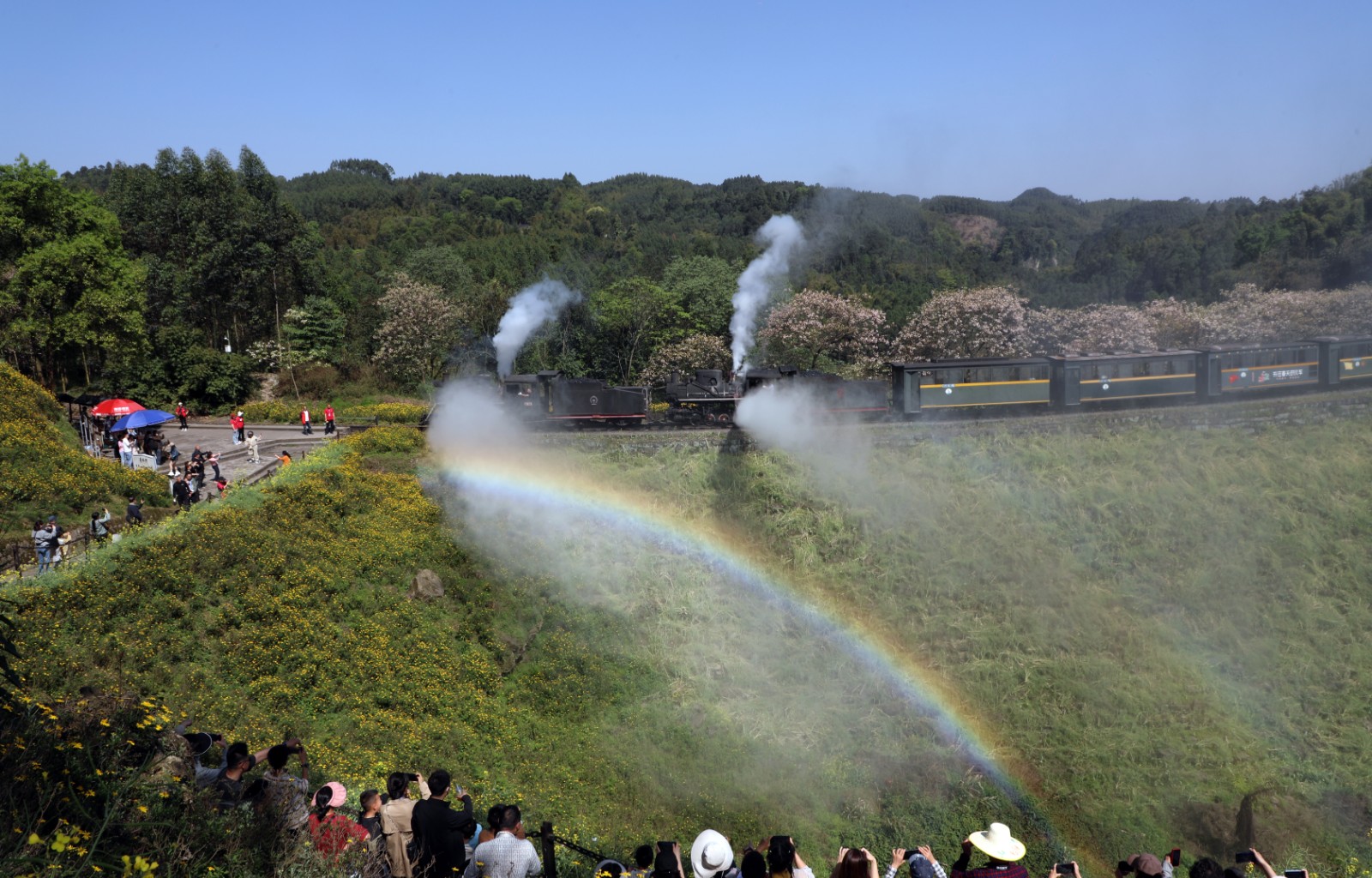 特色活动添活力,景区系列活动焕新登场。为丰富游客假日体验,景区精心筹备了一系列兼具趣味性与文化性的活动,让游客在赏景之余感受多元文旅魅力。除了经典的蒸汽小火车观光,景区还推出非遗文化展演、矿山歌手大联欢、川剧变脸、丰收季交公粮等特色活动,轮番上演的精彩节目为游客带来沉浸式体验;同时,研学体验也备受青睐,孩子们登上蒸汽小火车探寻动力原理,走进嘉阳国家矿山公园博物馆了解工业历史,深入黄村井矿井体验矿工生活,沉浸式感受春日美景与工业文化魅力。